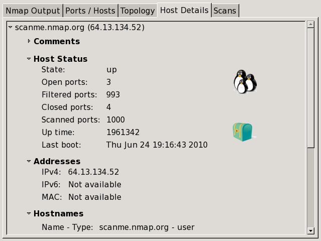 The “Host Details” tab breaks all the information about a single host into a hierarchical display. Shown are the host's names and addresses, its state (up or down), and the number and status of scanned ports. The host's uptime, operating system, OS icon (see Figure 12.5, “OS icons”), and other associated details are shown when available. When no exact OS match is found, the closest matches are displayed. There is also a collapsible text field for storing a comment about the host which will be saved when the scan is saved to a file (see the section called “Saving and Loading Scan Results”).