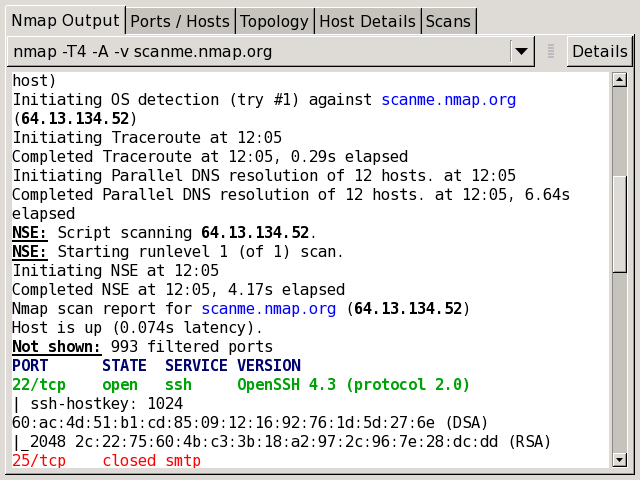 Recall that the results of more than one scan may be shown in a window (see the section called “Scan Aggregation”). The drop-down combo box at the top of the tab allows you to select the scan to display. The “Details” button brings up a window showing miscellaneous information about the scan, such as timestamps, command-line options, and the Nmap version number used.